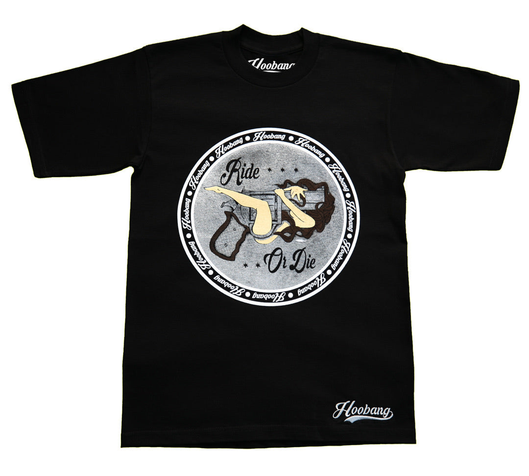 100% Cotton Black T-Shirt with "Ride or Die" Design manually hand painted onto front of shirt. "Hoobang" has also been stitched onto bottom section of shirt.